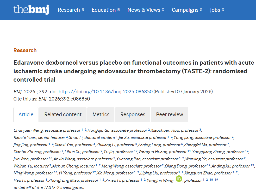 王擁軍院士團(tuán)隊TASTE-2研究登上《英國醫(yī)學(xué)雜志》腦細(xì)胞保護(hù)劑聯(lián)合取栓顯著降低致殘
